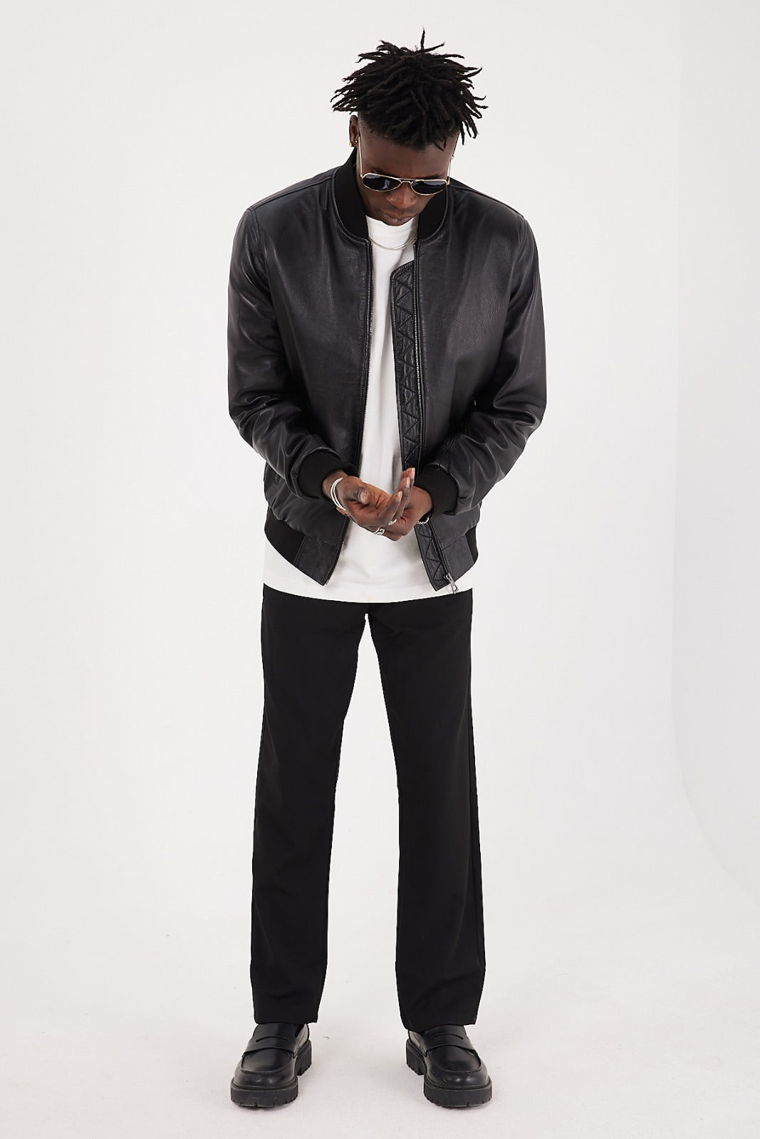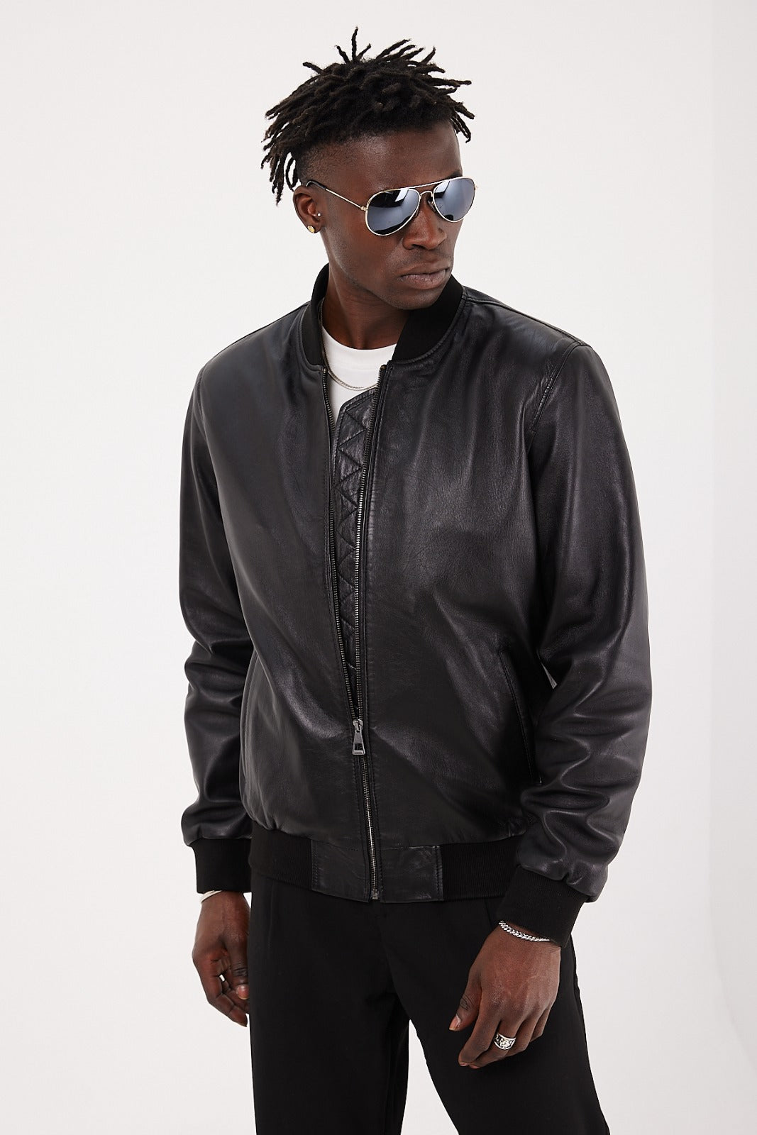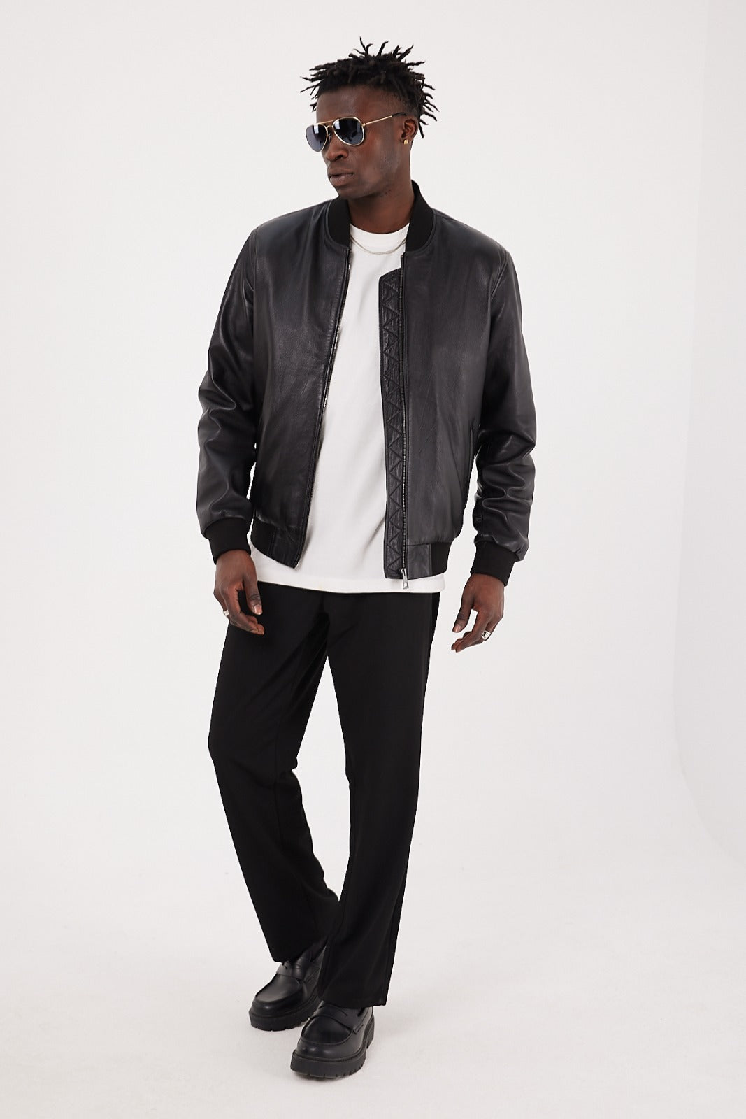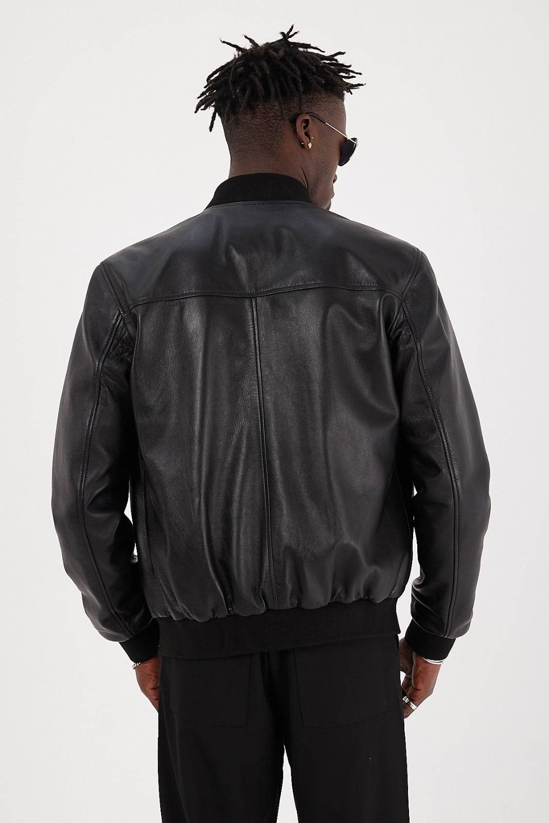 Stil sahibi erkekler için tasarlanan hakiki siyah deri kolej mont, modern görünümü ve konforlu yapısıyla öne çıkıyor. Triko yaka, kemer ve manşet detayları sayesinde klasik bomber tarzını yansıtırken, fermuarlı ön kapama ve astarlı iç yapısıyla hem kullanışlı hem de rahat bir deneyim sunar.