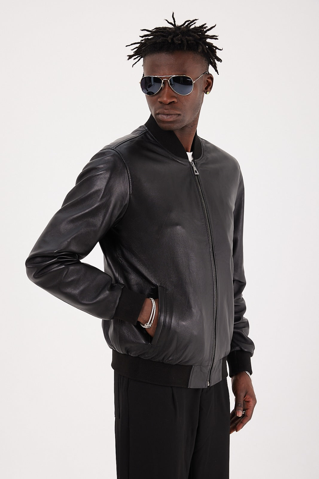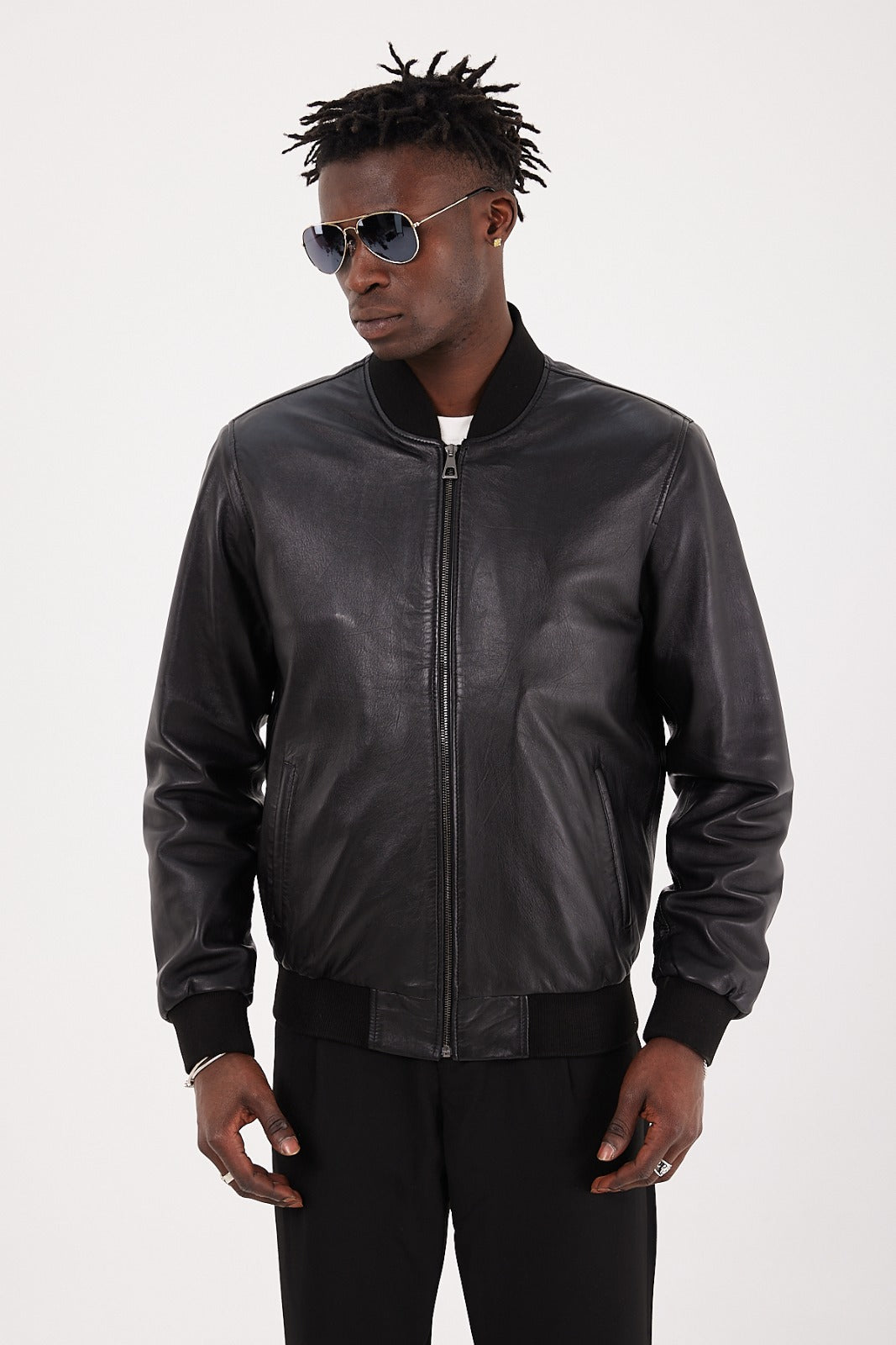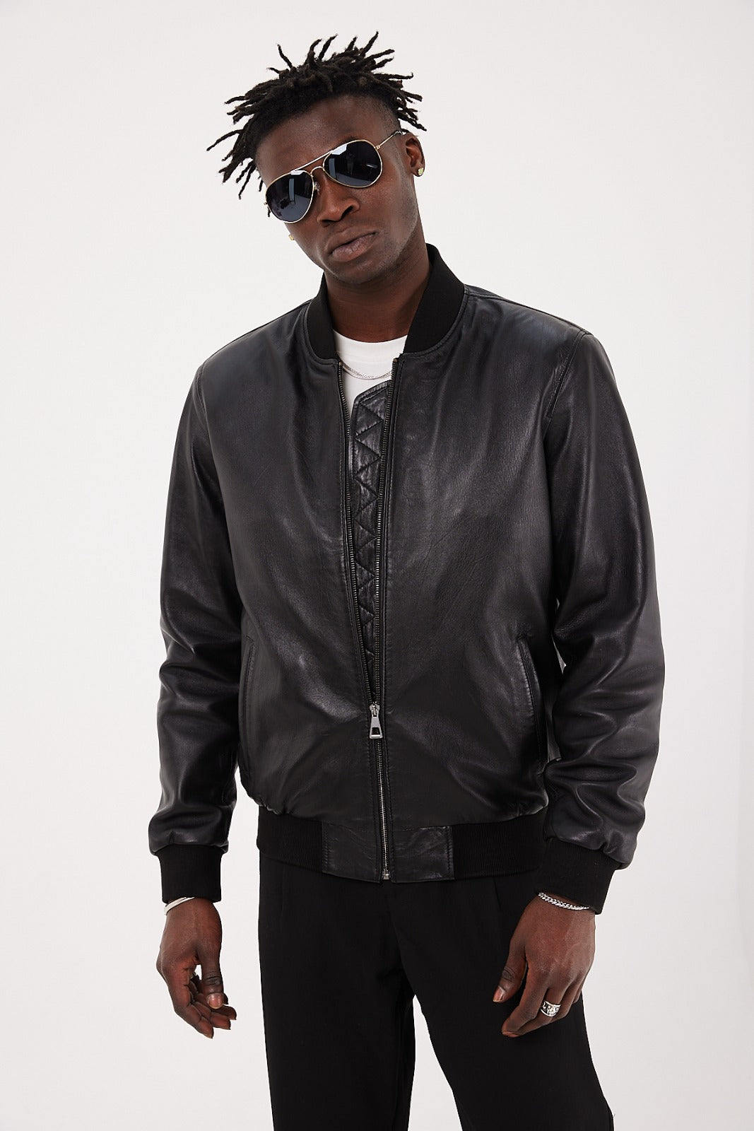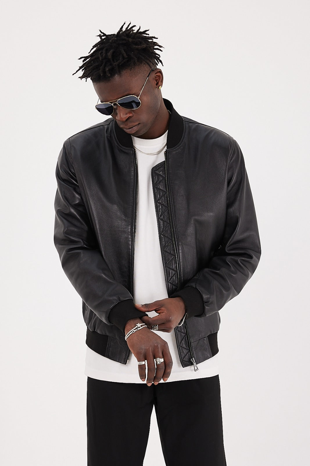 Stil sahibi erkekler için tasarlanan hakiki siyah deri kolej mont, modern görünümü ve konforlu yapısıyla öne çıkıyor. Triko yaka, kemer ve manşet detayları sayesinde klasik bomber tarzını yansıtırken, fermuarlı ön kapama ve astarlı iç yapısıyla hem kullanışlı hem de rahat bir deneyim sunar.