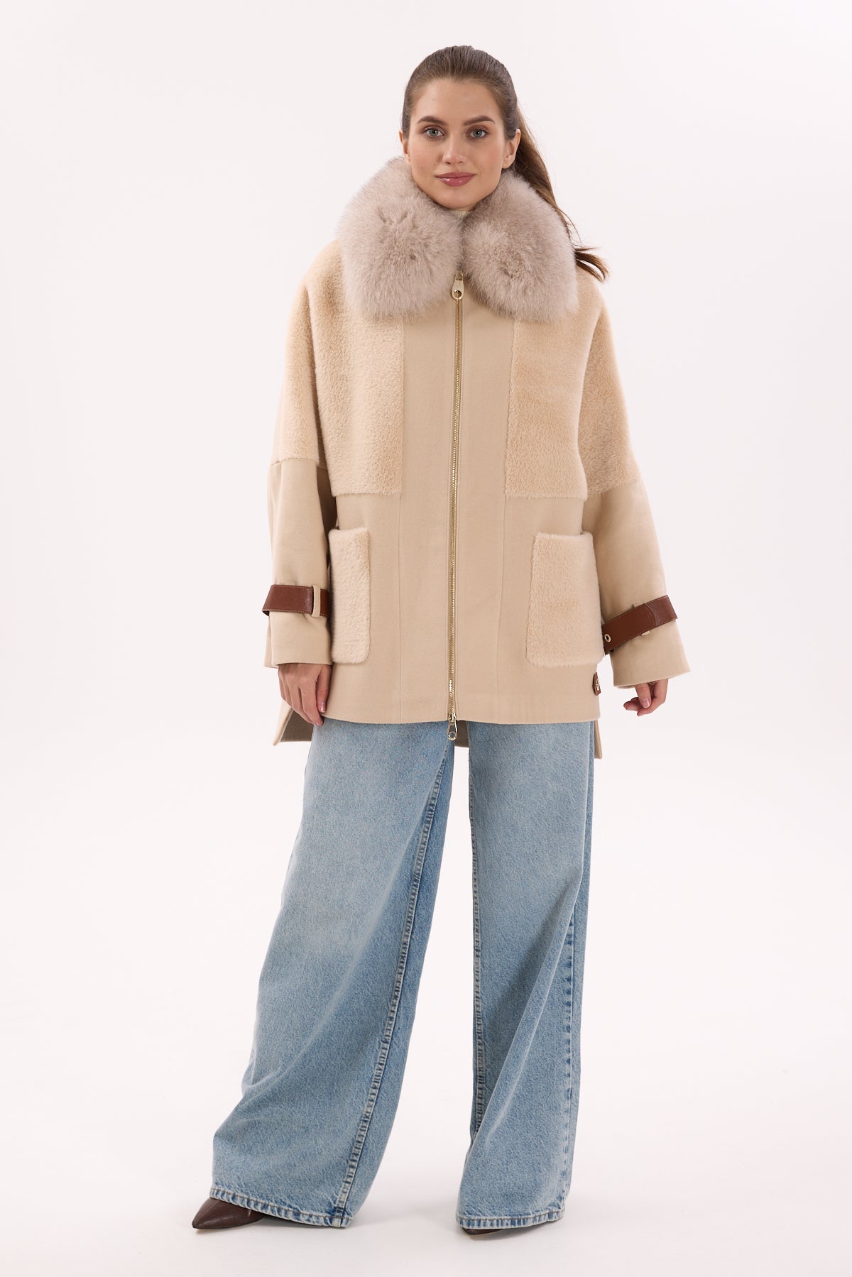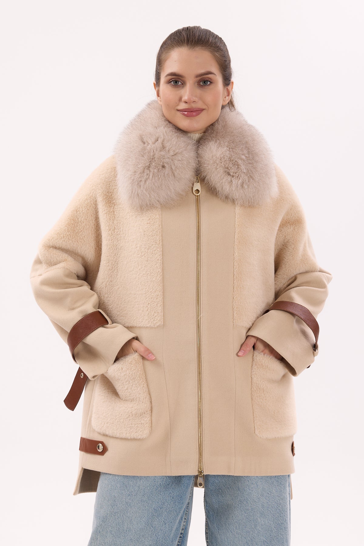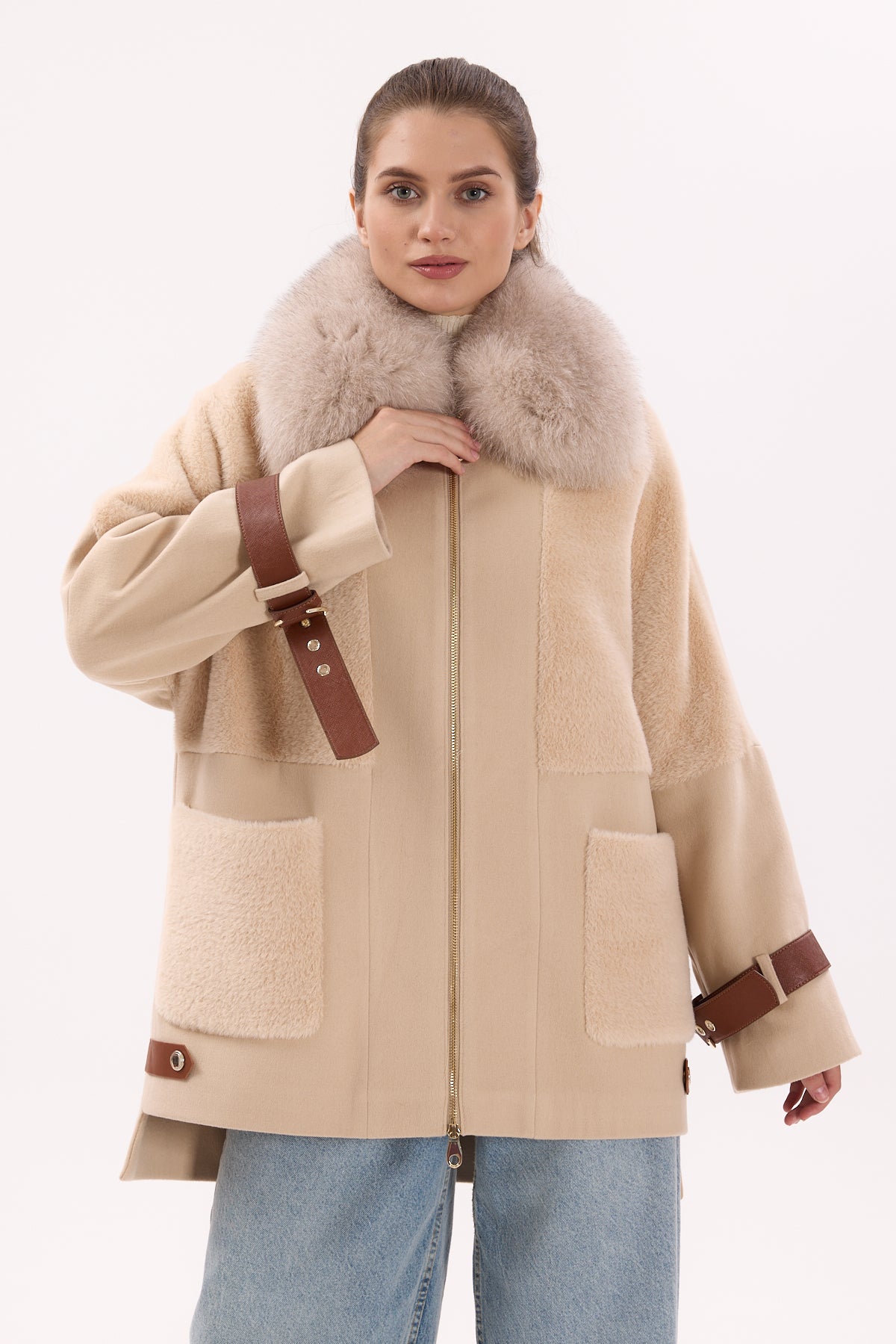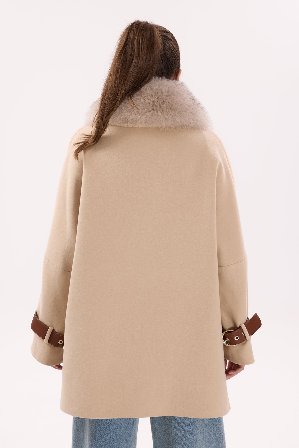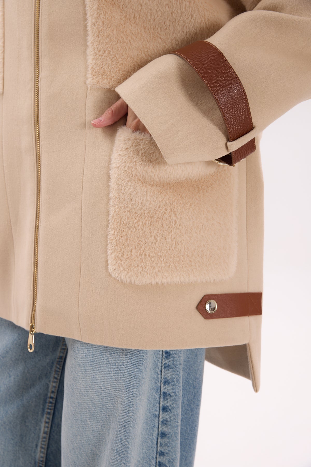 "Allegra" Bej Kürk Yaka Mont – Deri Tokalı Detaylı