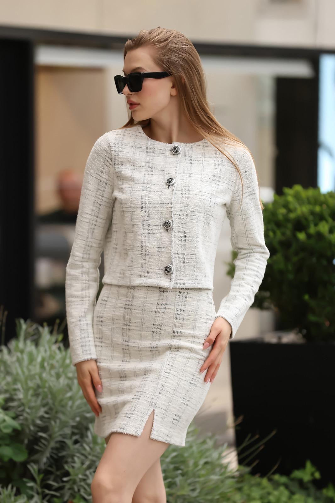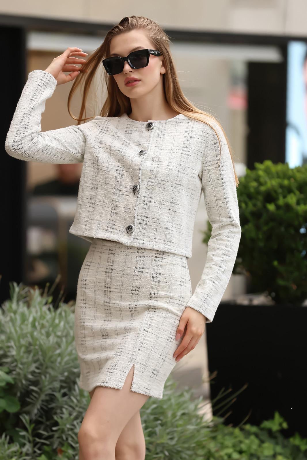 Şık ve modern tarzıyla öne çıkan ekose desenli ceket & etek takımı, hem günlük şıklıkta hem de özel davetlerde stilinizi tamamlar. Büyük düğme detaylı uzun kollu ceket, mini etekle uyumlu bir görünüm sunar. Eteğin ön kısmındaki küçük yırtmaç detayı hareket özgürlüğü ve feminen bir dokunuş kazandırır. Diz üstü çizmeler veya topuklu ayakkabılarla kombinlenerek sofistike bir stil elde edebilirsiniz.