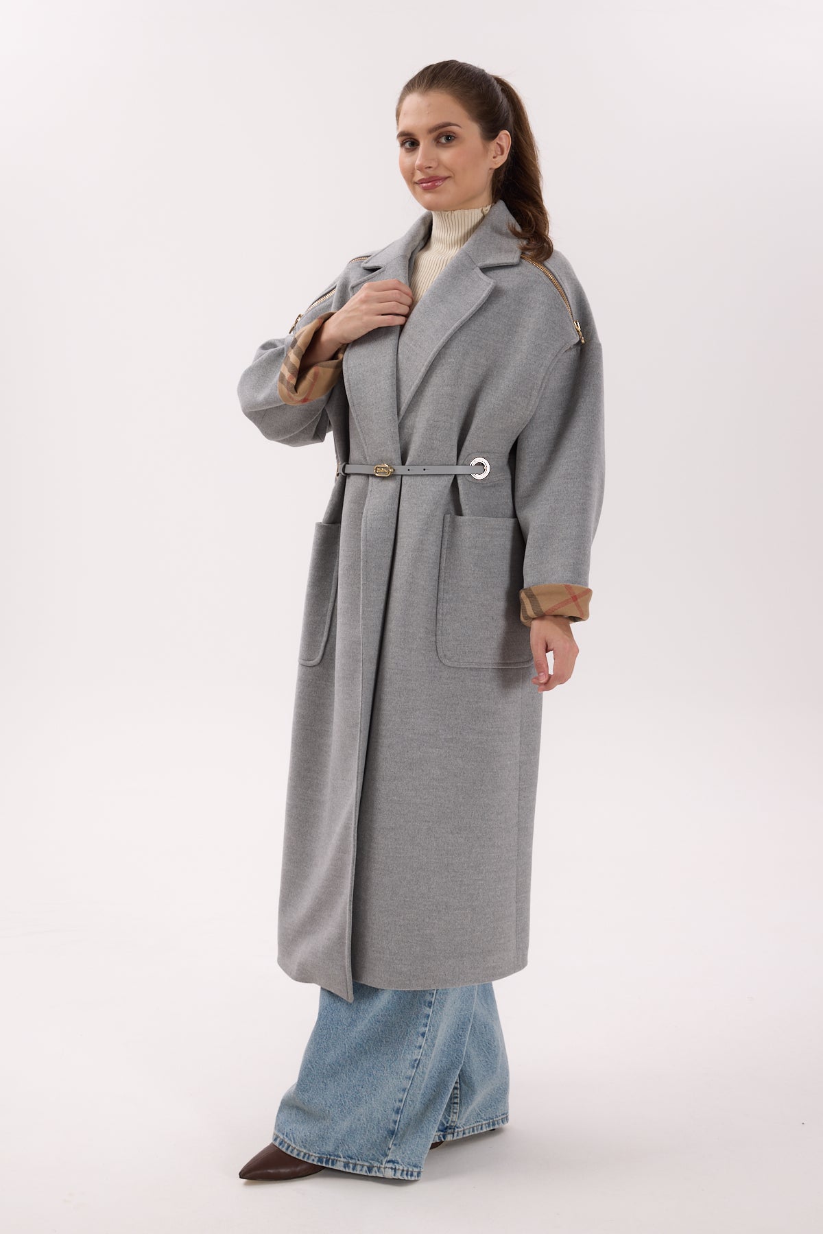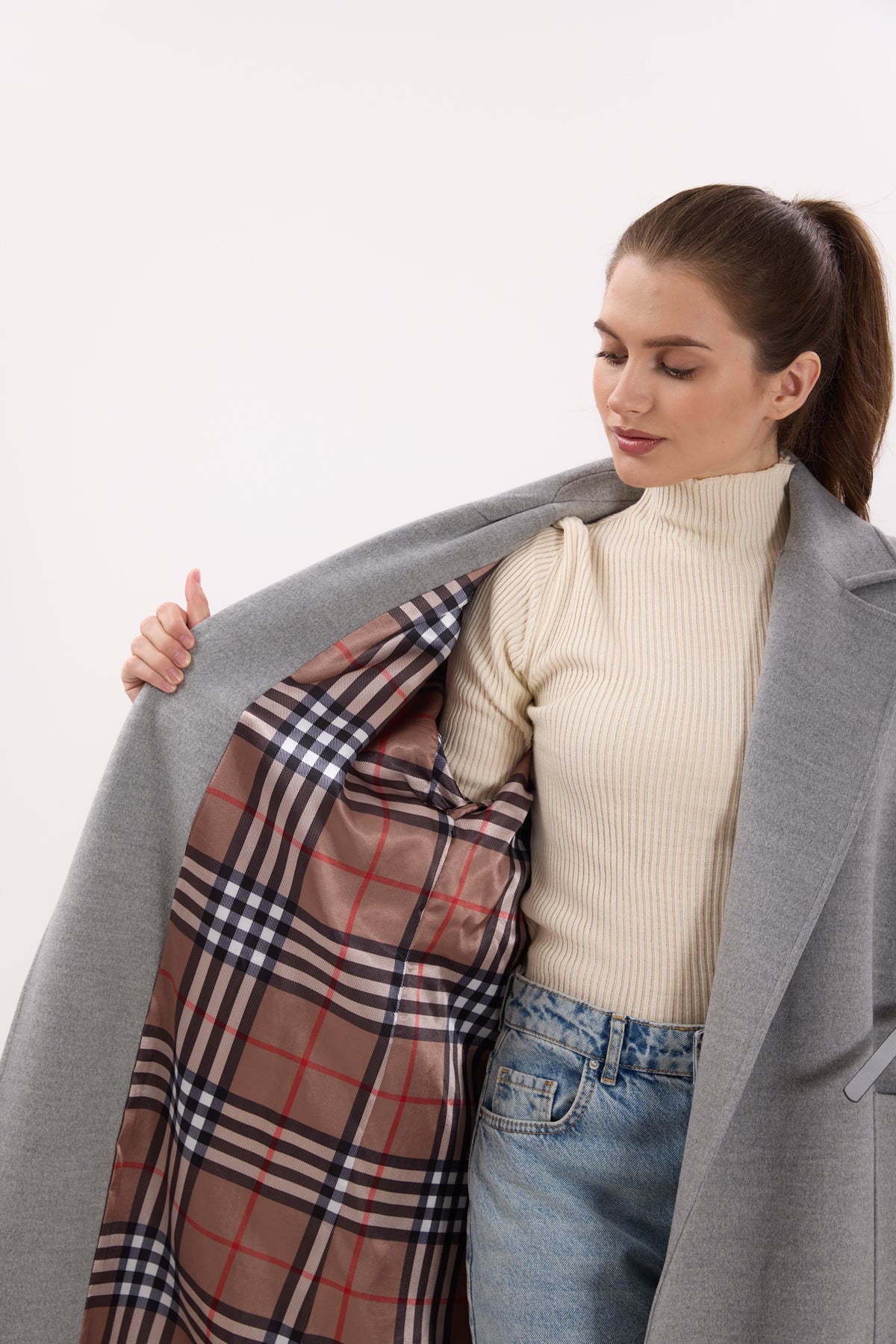"Belmont" Gri Oversize Yün Kaban – Ekose Detaylı