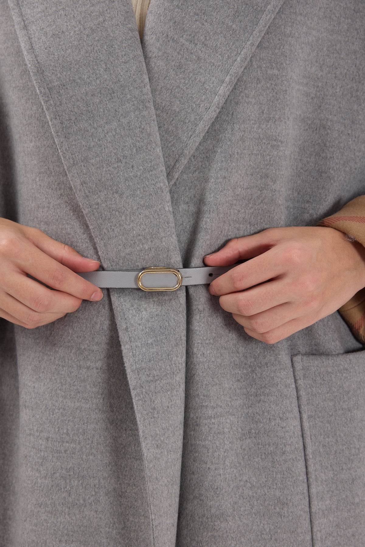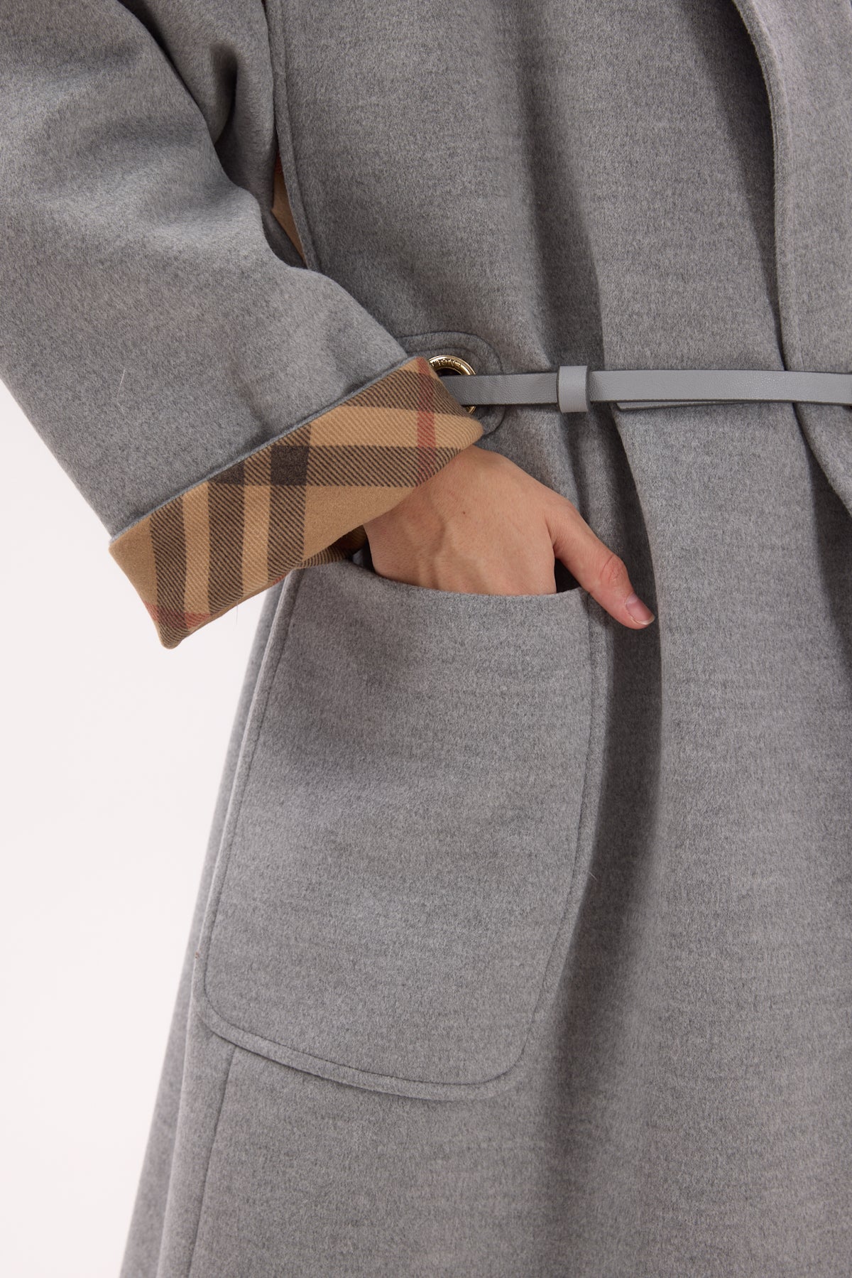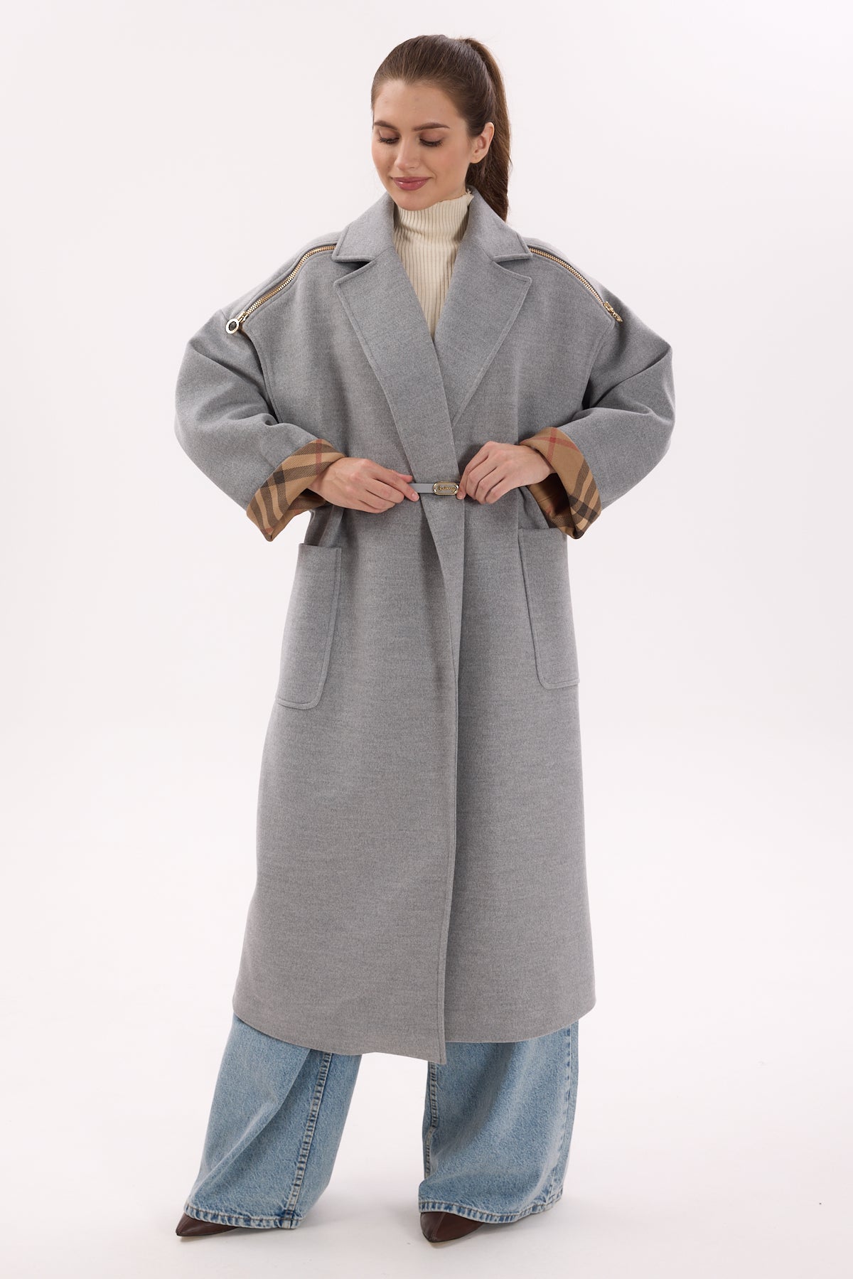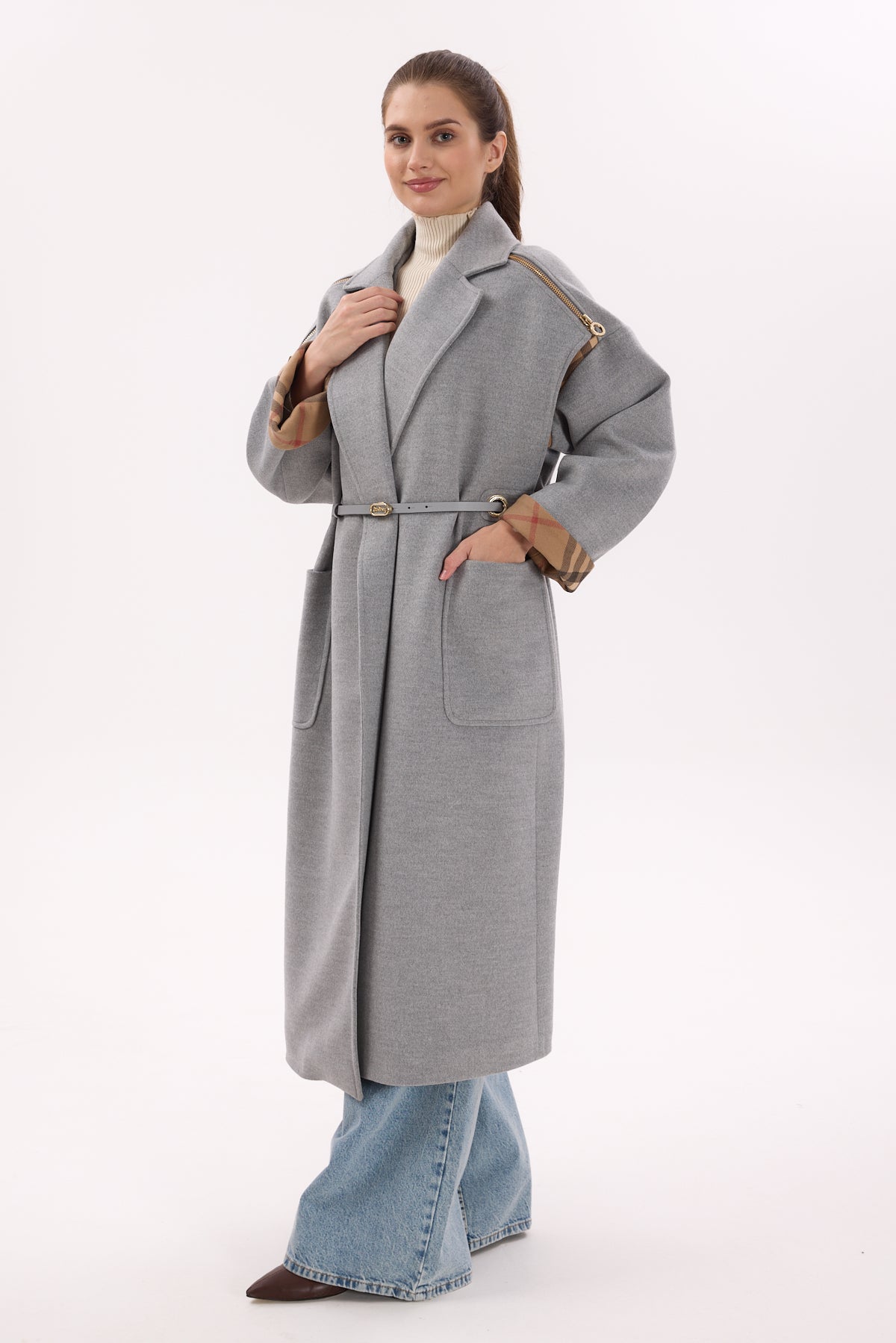 Zamansız şıklığın modern yorumunu sunan Belmont kaban, yumuşak dokulu gri yün karışımı kumaşıyla hem sıcak hem de hafif bir kullanım sağlar. Oversize silueti, özgür ve sofistike bir duruş yaratırken, omuzlardaki metal fermuar detayları çağdaş bir dokunuş katar. İç astarda yer alan ikonik ekose desen, kollar hafifçe kıvrıldığında zarif bir kontrast etkisi oluşturur. Minimal kemer tokası, tasarımın dengeli sadeliğini tamamlar.