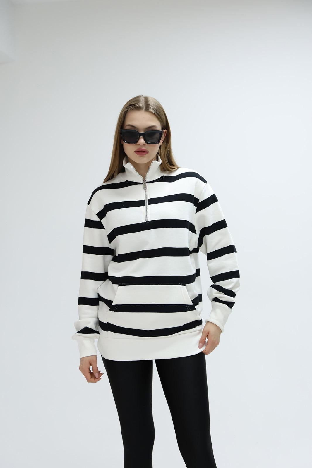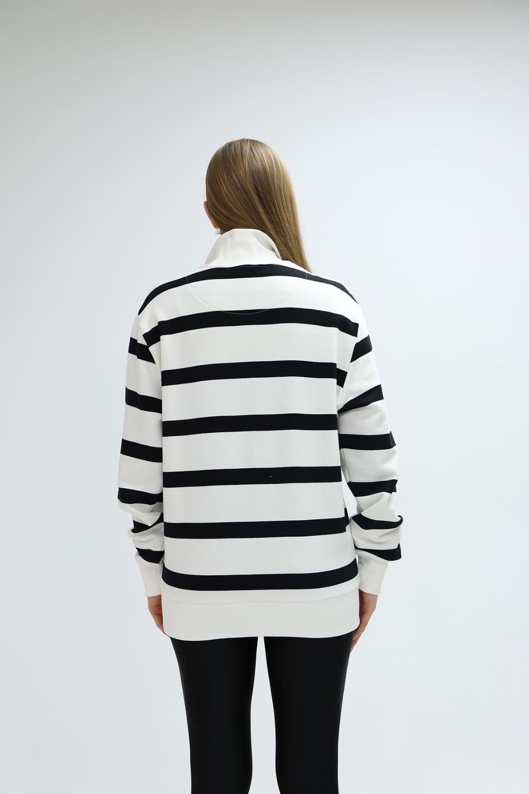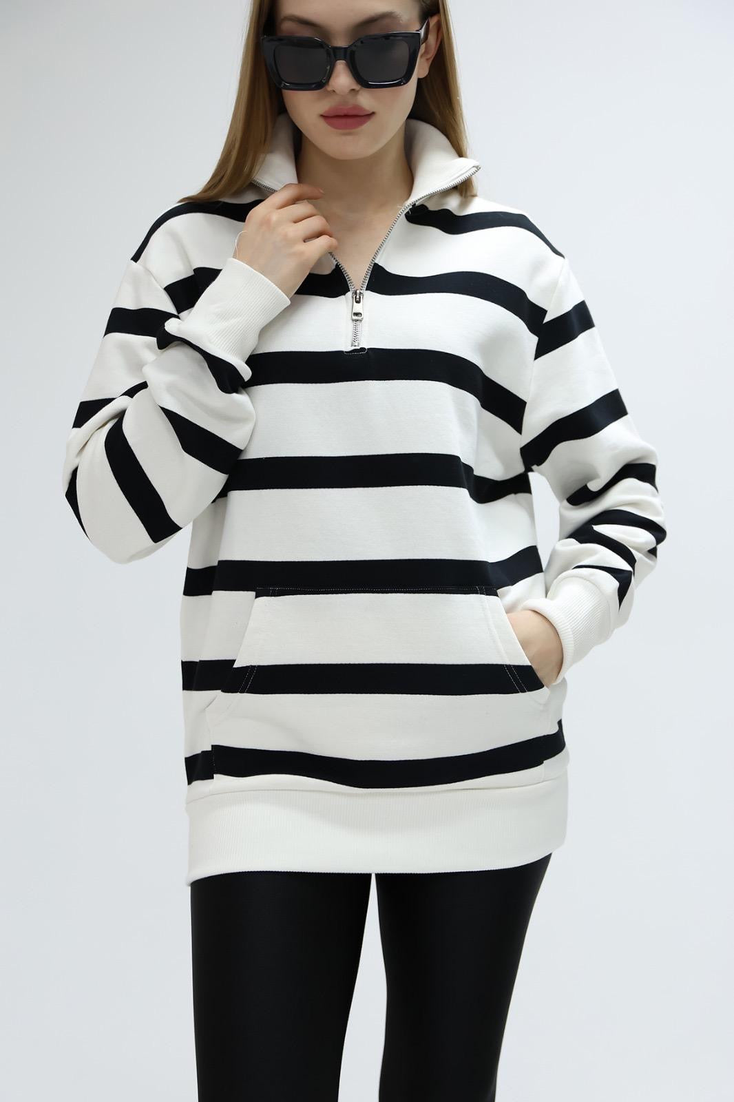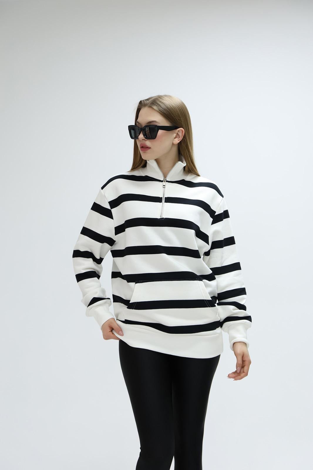 Siyah Beyaz Çizgili Fermuarlı Sweatshirt