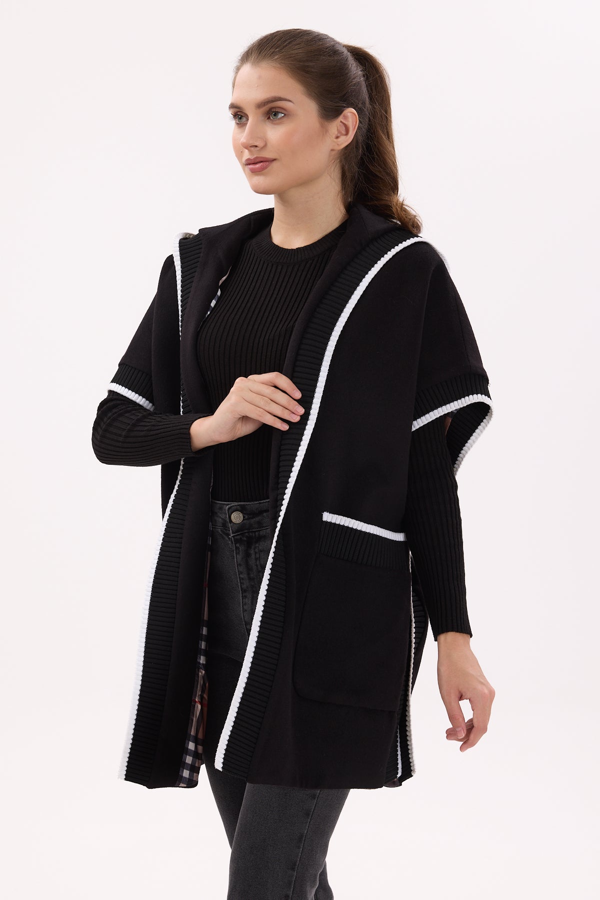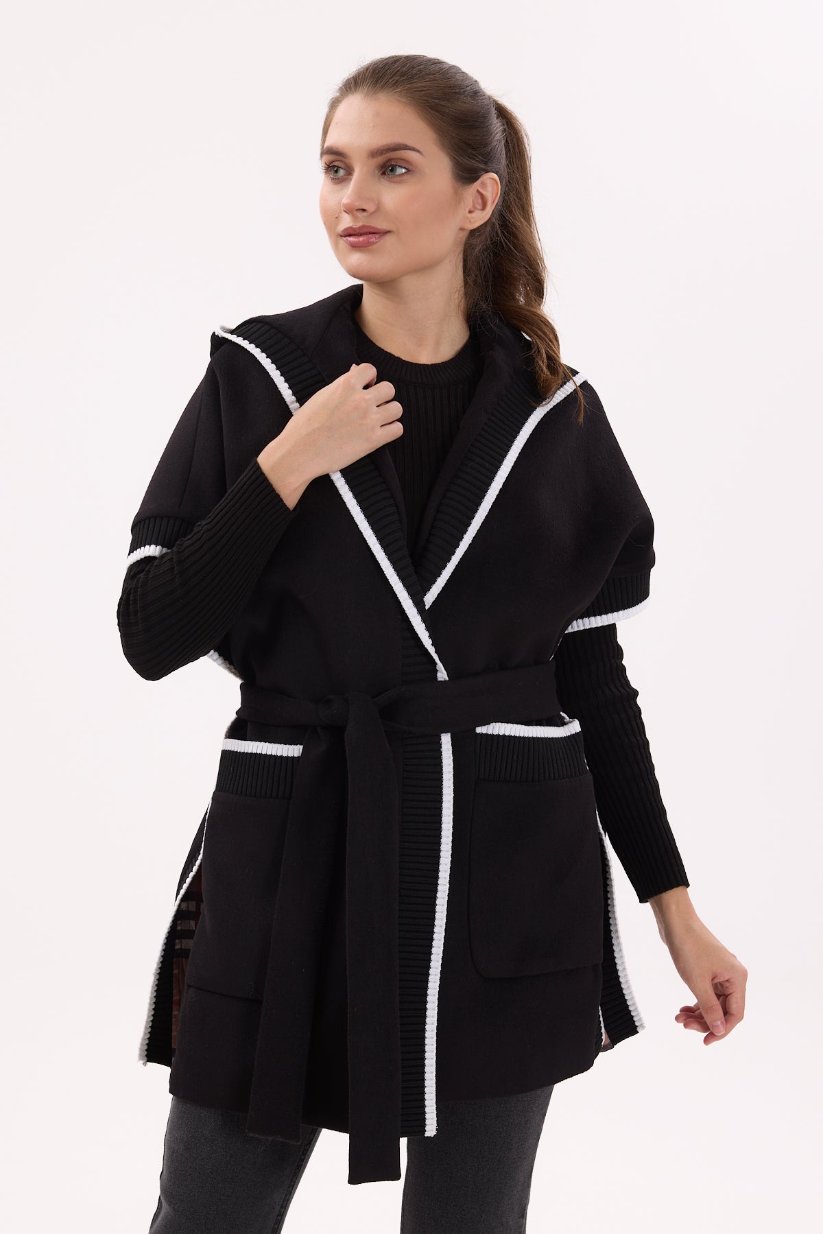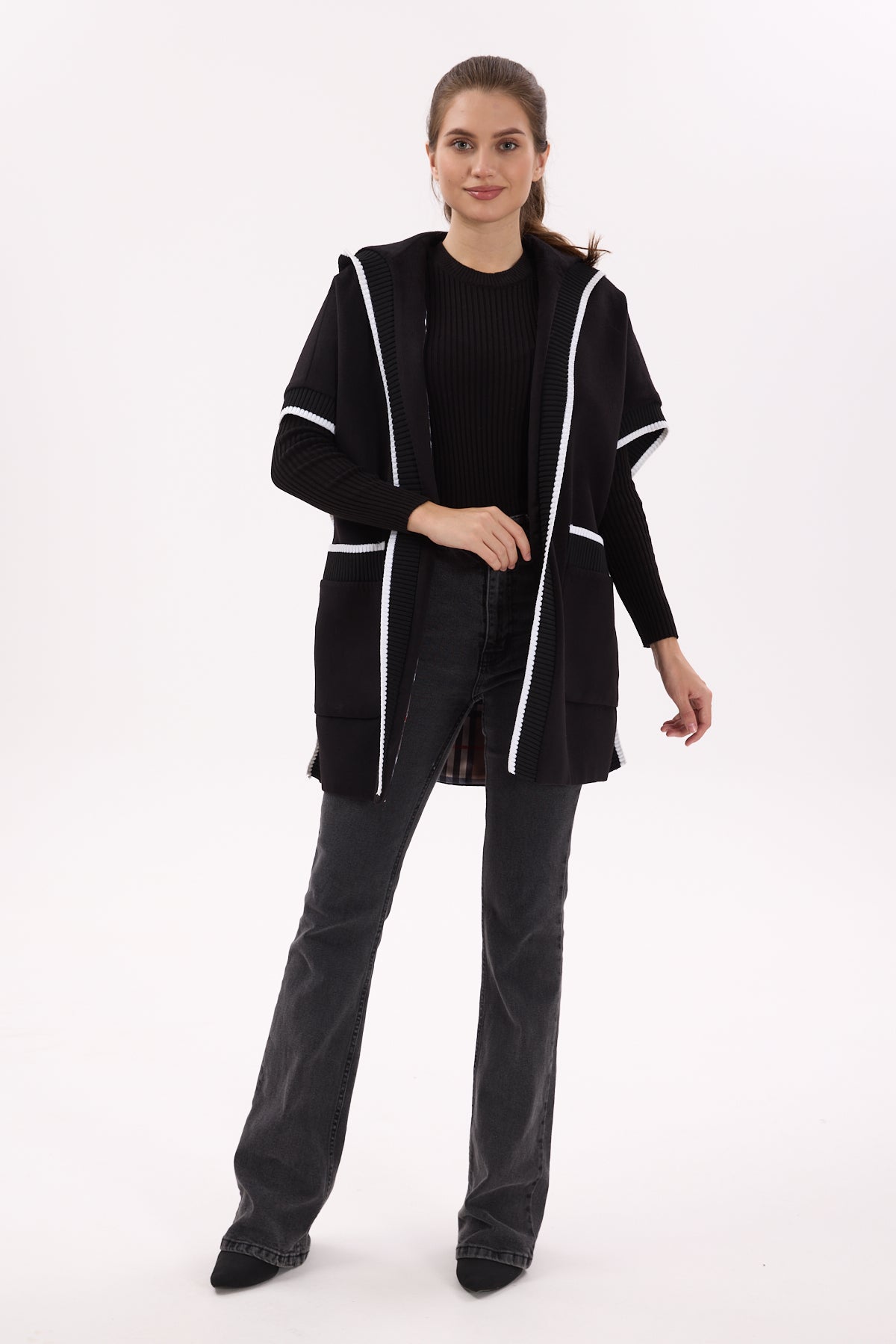 "Milano" Siyah Kapüşonlu Yelek – Beyaz Şerit Detaylı