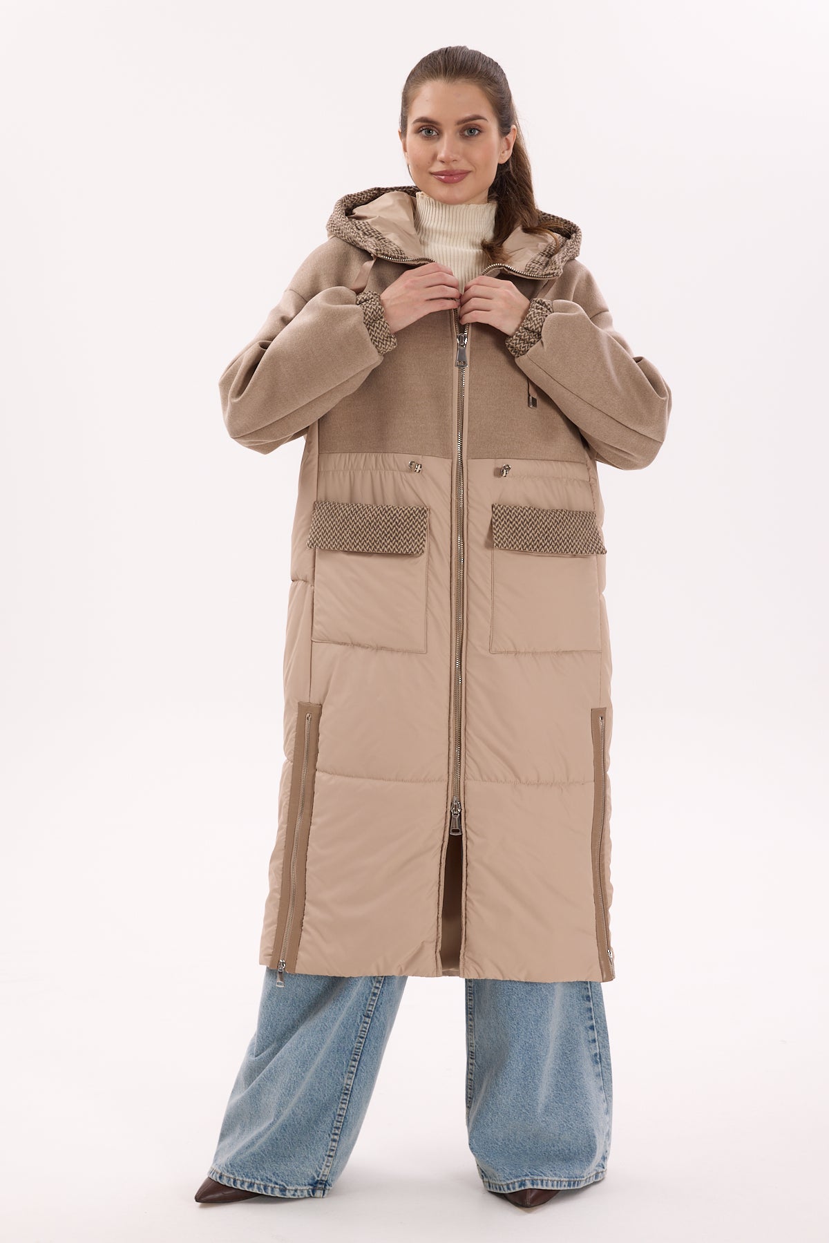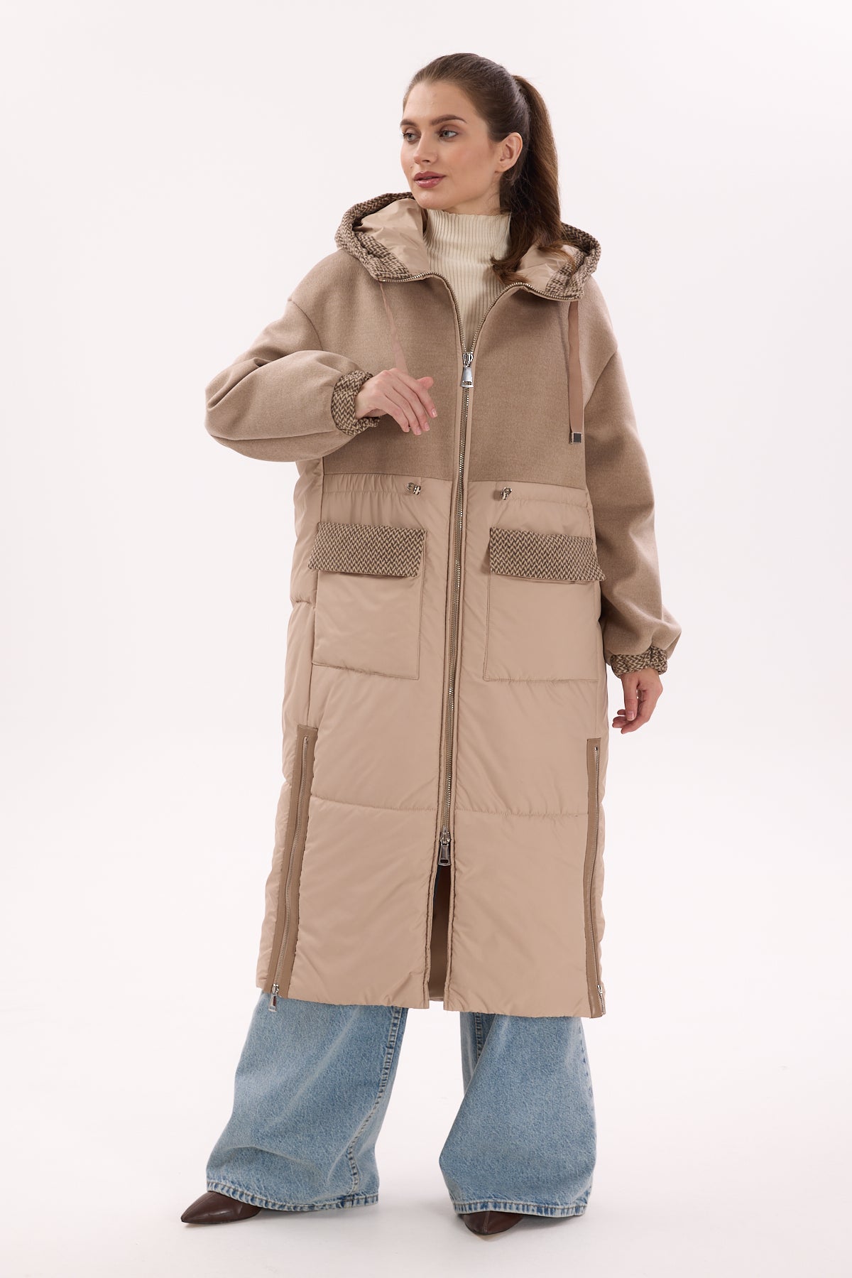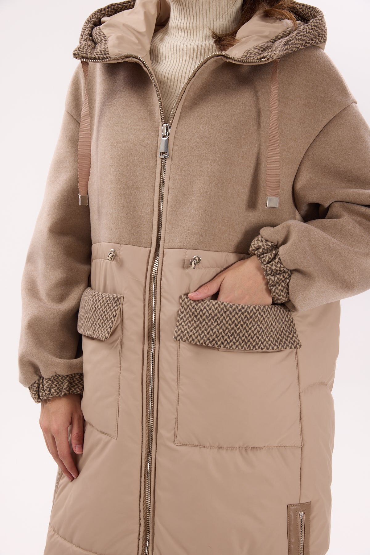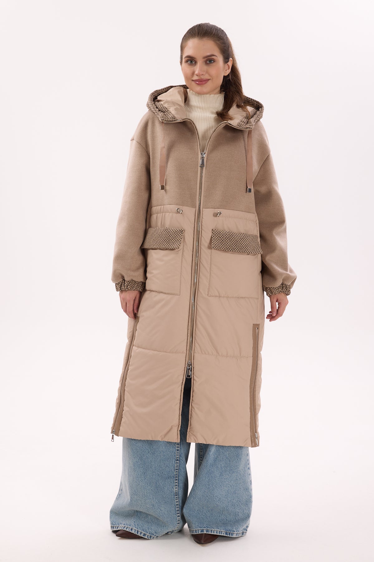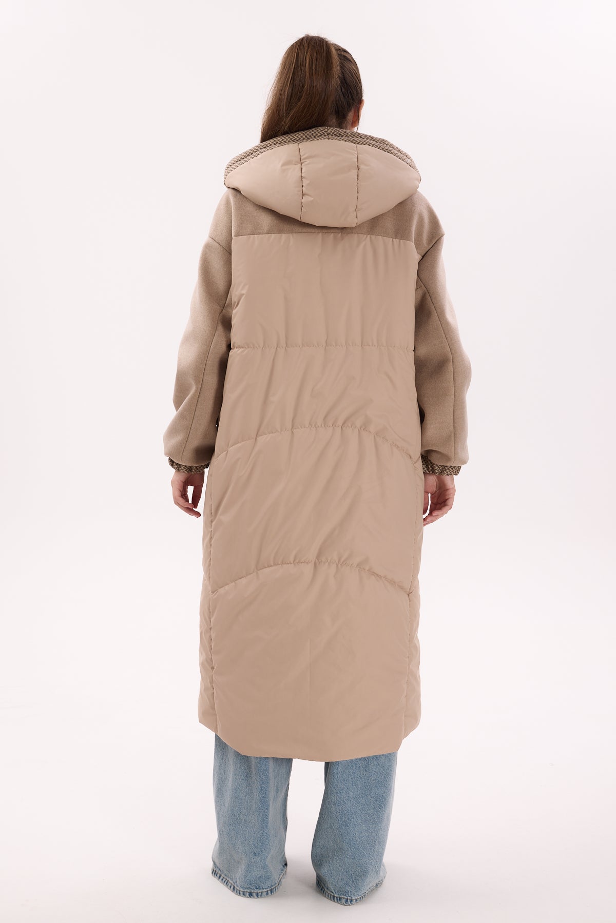 "Aspen" Kapüşonlu Bej Uzun Mont